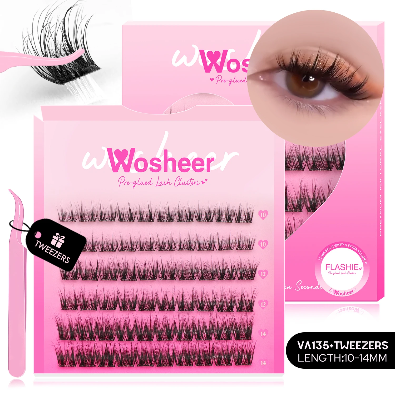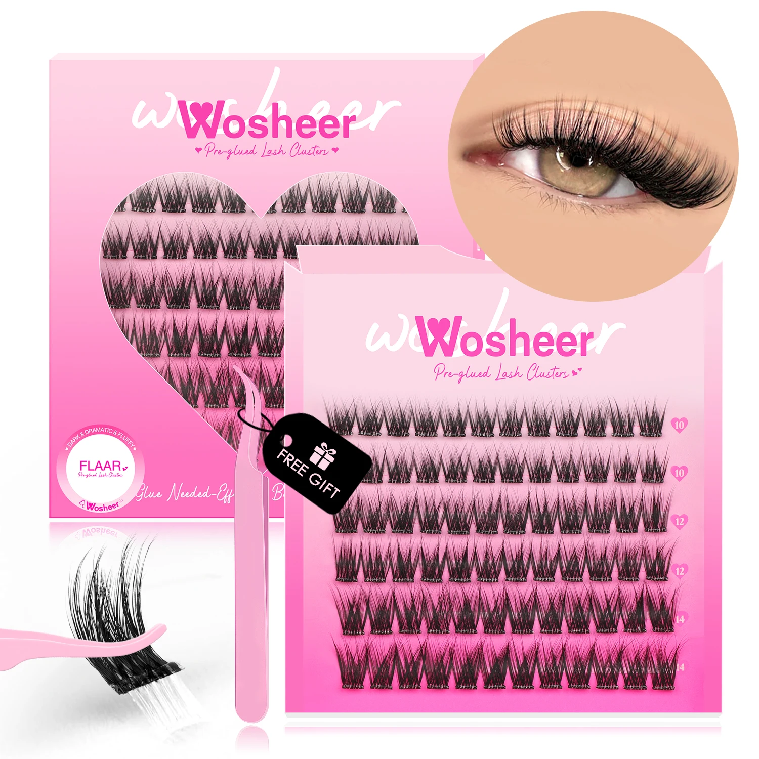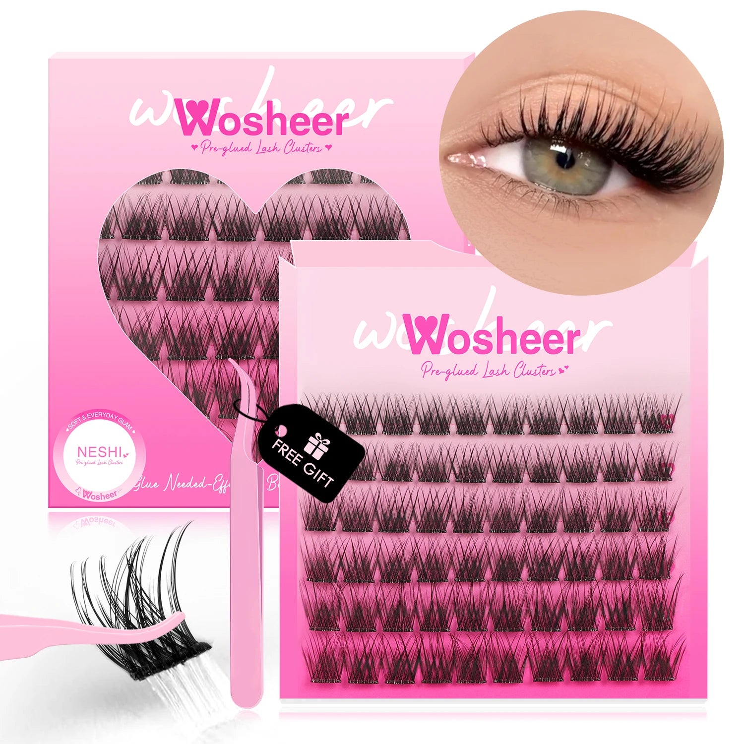 【High-Quality Lash Cluster】WOSHEER cluster eyelashes are hand-made of the highest quality fiber, vegan, cruelty-free, and virtually weightless. Ultra-light, tapered end, comfortable to wear.